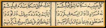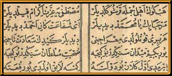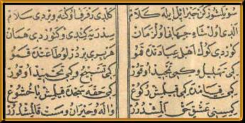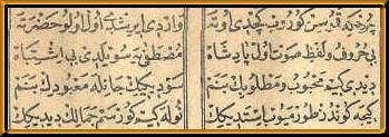* vardı erişdi o(l) Ulu Hazrete bi huruf-i lafz-ı savt (harfsiz, sözsüz, sessiz) o(l) padişah * Mustafa'ya (SAV) söyledi bi iştibah (benzetilemeyen bir şekilde) Dedi ki(m) mahbubu matlubun (sevdiğin ve istediğin) bene(i)m * Sevdiğin can ile mabudun (ibadet edeceğin) bene(i)m Bilmezem bu yolları ben nideyim * Kim (hem) garibem bunda kande (nereye) gideyim Gi(e)ce gündüz durmayub (durmayıp) istediğin * N(e)ola ki(m) "görsem cemalin" didigin (dediğin) |