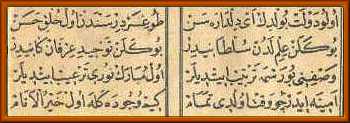 o(l) dürdanesi (inci) Çünkü Abdullah'tan oldu hamile * Vak(i)t erişti hefte vu eyyam (hafta ve günler) ile Hem Muhammed (SAV) gelmesi oldu yakin * Çok alametler belü(i)rdi gelmedin O(l) Rebiulevvel ayın nicesi * Onikinci gece isneyn (pazartesi) gecesi Dedi "gördüm" o(l) habibin (sevgilinin) A(n)nesi * Bir acep (acayip) nur, ki(m) güneş pervanesi |