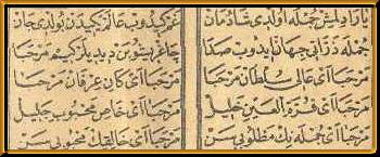(yok olup) alem yeniden buldu can * Cümle zerrat-ı cihan (dünyadaki zerreler) idüp sada (seslenip) * Çağruşuben (bağırarak) dediler ki(m) Merhaba Merhaba ey Ali sultan (yüce Sultan) Merhaba * Merhaba ey Kan-ı İrfan (İrfan Kaynağı) Merhaba * Merhaba ey Kurrat-ul Ayni (Gözümün nuru) Halil (dost) * Merhaba ey Has-ı Mahbub-i Celil (Allah'ın içten sevdiği) * Merhaba ey cümlenin (herkesin) matlubu (istediği) sen * Merhaba ey Halik'ın (Yaratıcının) mahbubu (sevdiği) sen |