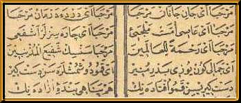 ey derde derman merhaba Merhaba ey asi ümmet melcei (sığınağı) * Merhaba ey çaresizler eşfei (şefaatçisi) * Merhaba ey Rahmetellil Alemin (Alemlere Rahmet ) * Merhaba sensin şefial Müznibin (günahkarların şefaatçisi) * Ey Cemal-i gün (çeşit çeşit güzellik) yüzü Bedr-i Münir (parlak - dolunay) * Ey Kamu (bütün) düşmüşlere sen destgir (yardımcı) Destgirsin (Yardımcısın) kamu (tüm) üftadenin (düşkünlerin) * Hem penahı (sığınacak yeri) bende-i azadenin (azad kölenin) |