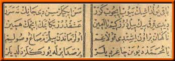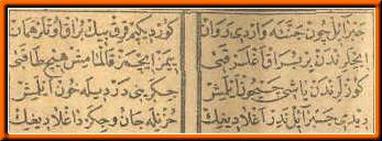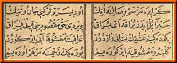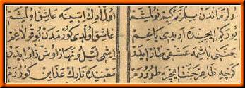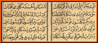 * Sen inlersin, di(e) canın ne sezer Dedi, kırkbin yıl durur ki(m), ya Emin * Aşk dur(ur) (aşkdır) bana yemek içmek hemi(e)n Nagehan (ansızın) bir ün (ses) işitti kulağım * O(l) zamandan (beri) bilmezem sağ u (ve) solum Ya Muhammed (SAV) deyuben (diyerek) çağırdılar * Bir sa(e)da birle yürekler deldiler. |